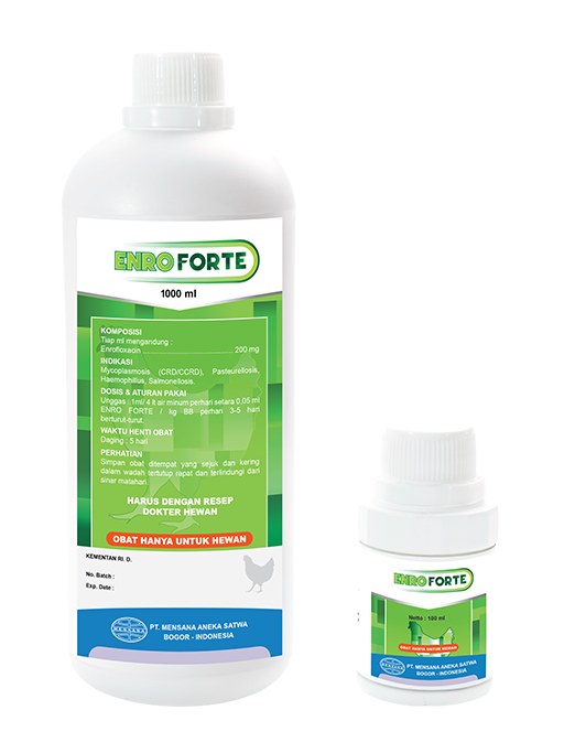 ENRO FORTE mengandung Enrofloxacine konsentrasi tinggi yang sangat efektif melawan kuman Mycoplasma gallisepticum dan infeksi sekunder lainnya. Bersifat bakterisidal yang bekerja merusak enzym DNA-gyrase, mudah dilarutkan, mempunyai homogenesitas yang tinggi dan cepat diabsorbsi