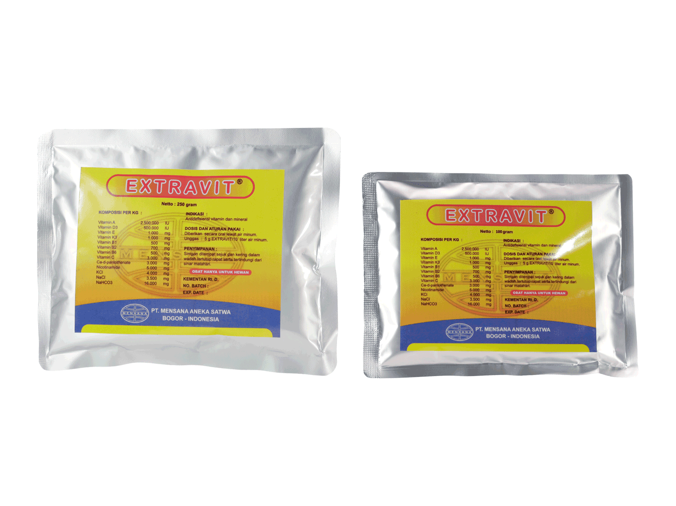 EXTRAVIT Merupakan produk yang mengandung vitamin yang dibutuhkan unggas pada saat kondisi stress atau pada waktu proses pemulihan setelah terserang penyakit, Memberikan perlindungan kesehatan sekaligus mencegah defisiensi vitamin pada unggas